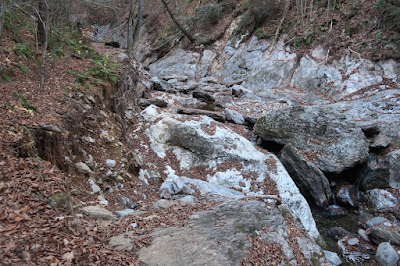 A section of the White blazed woods road off Spruce Brook Road at the base of a large waterfall is washed away, as seen on Nov. 3, 2024. The photo is fuzzy due to camera shake.  |